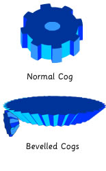 Cogs can also be used to change the direction of turn by locking them together at 90° using bevel gears (a special type of cog).