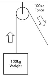 You need to use 100kg of force to keep the weight held up, and have to pull 1m of rope to lift the weight 1m.