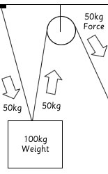 When I pull on the rope I only need to use 50kg of force to lift the 100kg weight, but I will need to pull 2m of rope to lift the weight 1m.